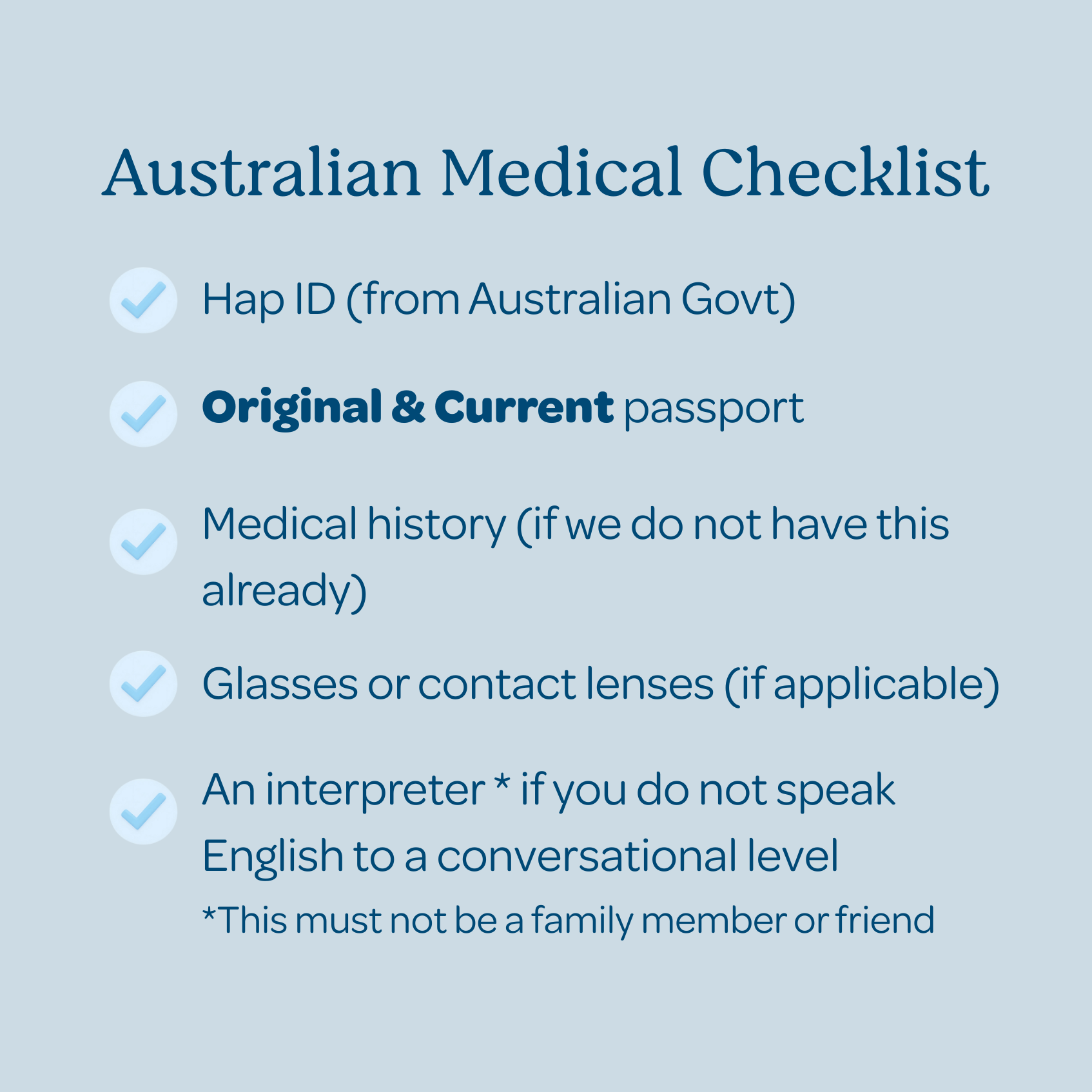 Please be well prepared for your Australian Medical. Refer to the checklist of documents above and arrive well in advance of your appointment.